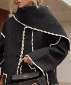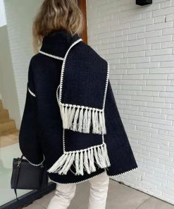2PCS Women Single-Breasted Jacket Autumn Winter Black Scarf Collar Wool Embroidery White Fringed Cardigan Female Contrast Color Coat